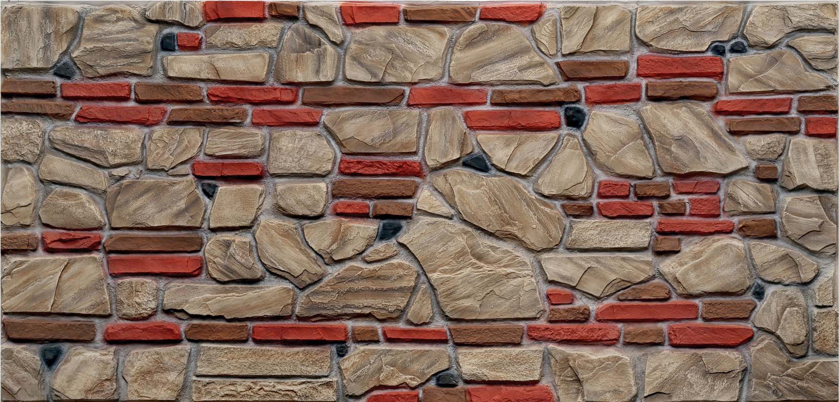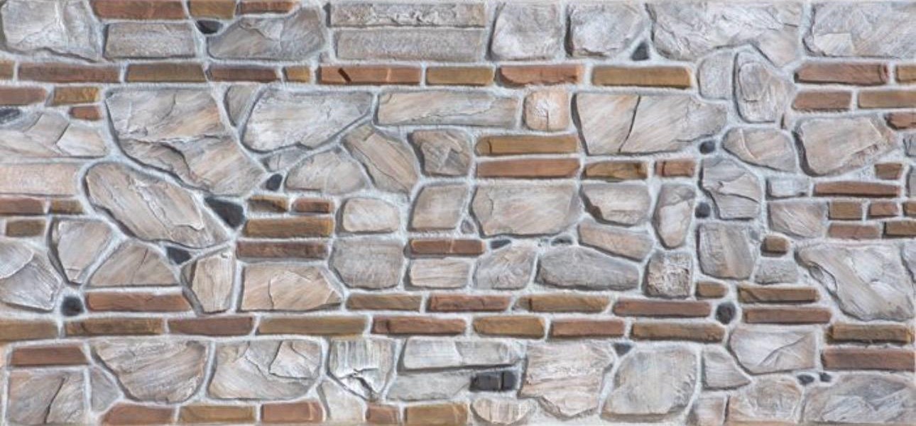Malzeme: Yüksek Kaliteli Polyester (Fiberglas Takviyeli Polyester Reçine veya benzeri kompozit). Bu özel fiber panel, farklı boyut ve dokulardaki doğal taşlarla rustik tuğlaların birleşimini yansıtan özel yüzey kalıplaması ile üretilmiştir.